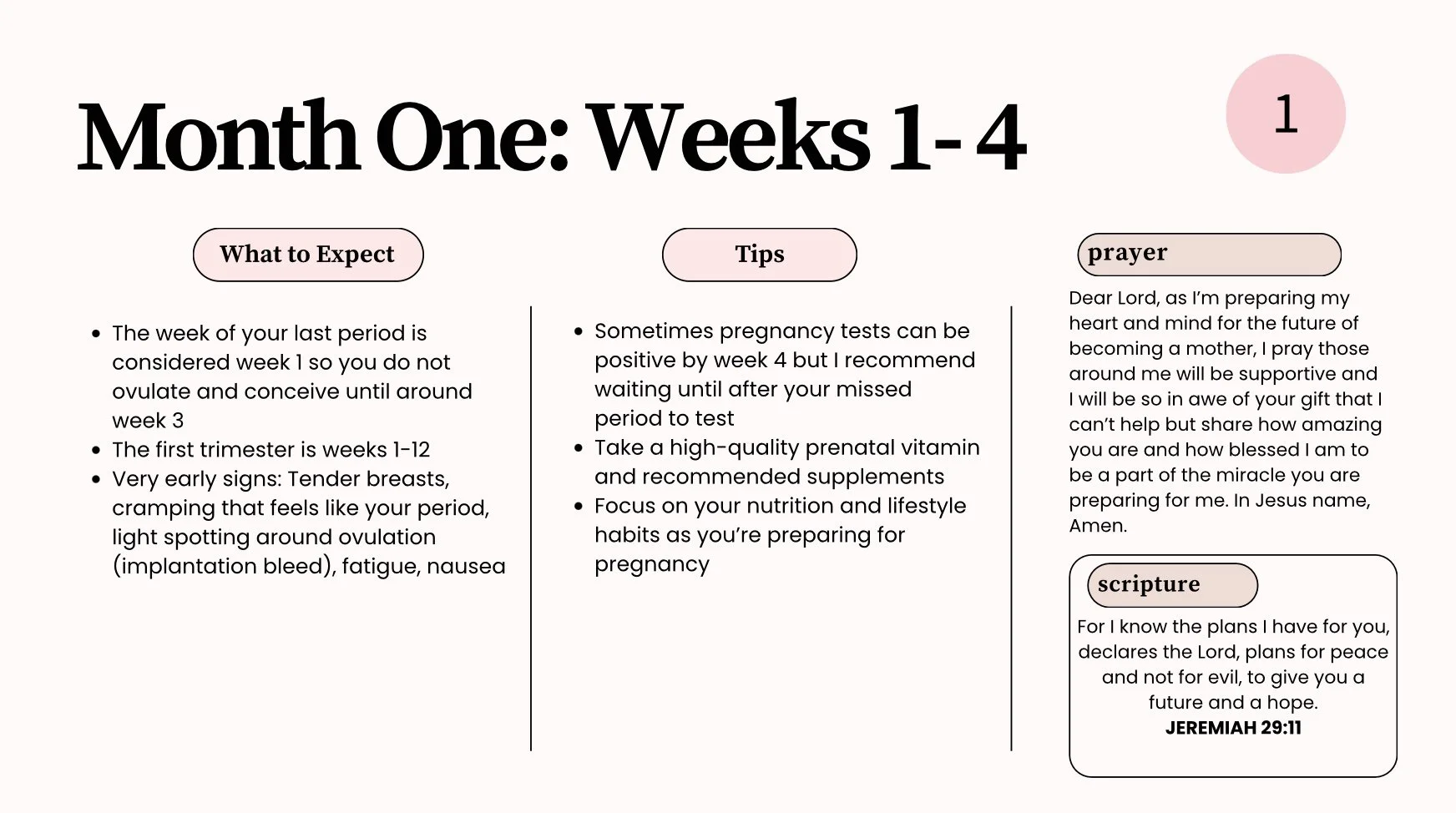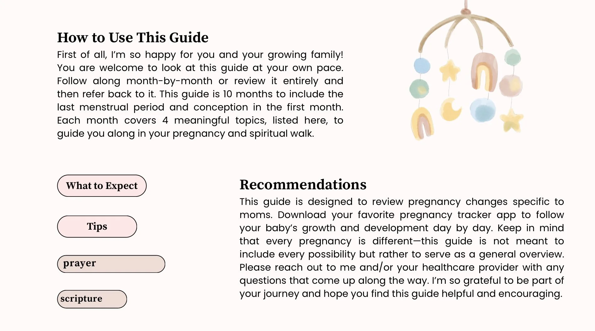 A 17-page (title and end pages included), month-by-month pregnancy guide focused on what to expect, tips, prayer and scripture. The four stages of labor and birth are briefly discussed along with considerations in childbirth class and hiring a doula. All women can benefit from this guide, particularly those of faith planning a natural birth. See sample below and reach out to me with any questions you have about the guide.